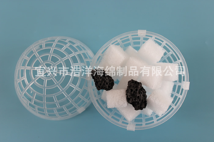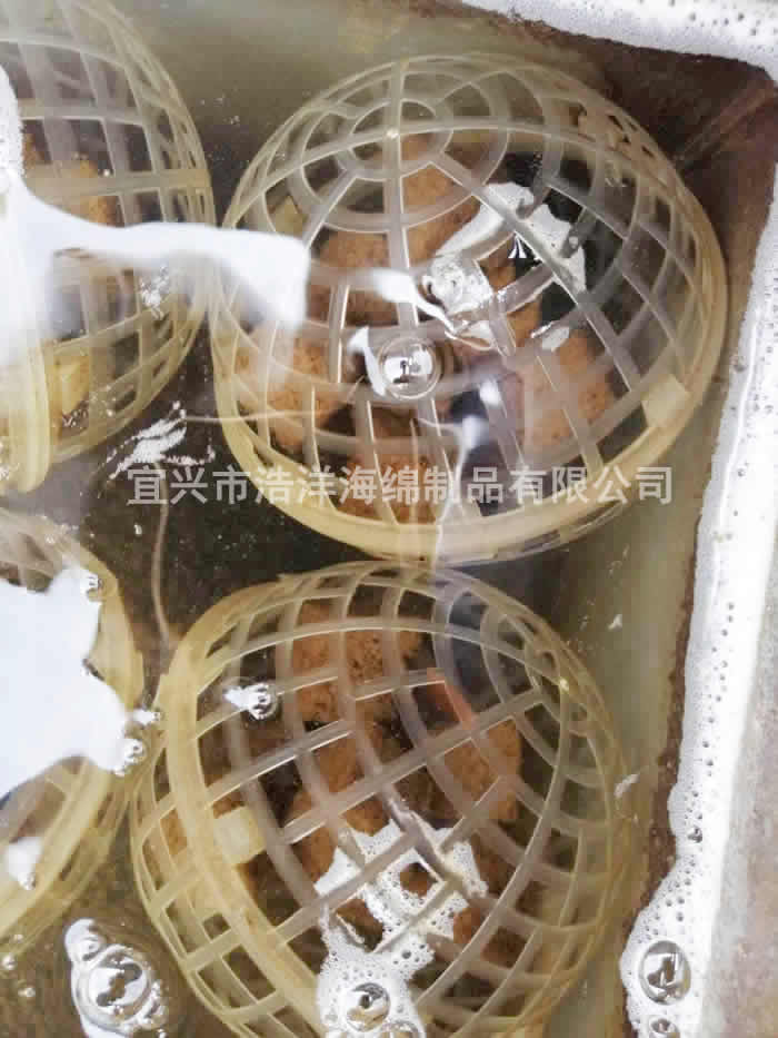 將我公司特殊工藝生產(chǎn)的聚氨酯海綿作為培菌載體。填充在 PP / PE 材質(zhì)制作的懸浮球中,由于該生物載體的多孔網(wǎng)狀特殊結構,提高了生物培養載體的比表面積。突破點(diǎn)是在曝氣池內單個(gè)生物載體的外表面實(shí)現亞硝化反應,在內部實(shí)現亞硝酸鹽的反硝化,其中不僅有簡(jiǎn)單的物理吸附,還有正、負電荷的引力。使載體表面帶有一定的陽(yáng)離子活性基團及經(jīng)基等親水性基團,可與污水中帶有負電荷的微生物產(chǎn)生鍵、價(jià)的固定結合,從而將微生物及生物酶牢固的固定在載體上。使成活后的微生物不容易在水、氣的剪切作用下流失。微生物的負載量大,容積負荷高,從而使污水中的氨氮、總氮達到同時(shí)下降的目的。它同時(shí)還具有切割氣泡能力強,空間體積利用率大、無(wú)死區等優(yōu)點(diǎn)。是當前生物處理技術(shù)中微生物載體理想的產(chǎn)品。